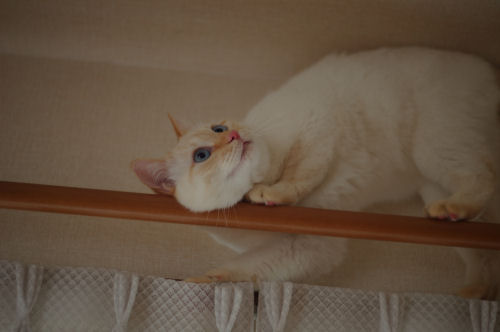 桃さんはもう大きいのにカーテンレールの上に