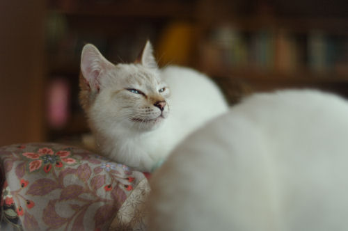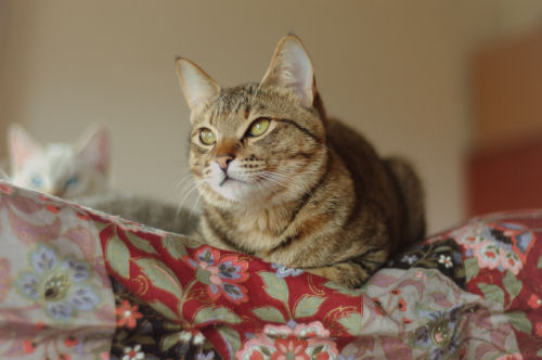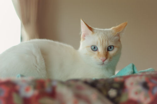 今年も庭の「おだまき」の花が咲きました。 このおだまきは原種の日本原産「深山おだまき」 毎年どんどん増えていきます。 土壌と相性がいいのでしょうね (自宅の庭にて・・・) マリーシャ: 5月2日で子猫たちが7ヶ月になりました 元気な様子をあらためて紹介しま~す。 母の貫禄がますますついてきたマリーシャ。 つい先日は子猫たちのために鳥を捕らえてきました。 (その模様は後日・・・・) クレア : 小顔でスリムに成長しました。人でもこういう女の子っているなぁってよく思います。 ジャンプしても実にしなやか身軽なので物音1つしません。 人なつっこくて、よくお鼻であいさつに来ます。 チャレンジャーで打たれ強いところは幼猫時代とまったく変わっていません。 特に桃と仲良しです。 桃 : おおらかで大胆な桃。少しオスらしくなってきました。 膝の上で眠るのが大好きあいくるしいほど愛嬌満点。 しゃべりながら走っていく姿はとてもかわいらしいです。 クレアが気分悪そうだった時、すっ飛んできて介抱していました シェリー : 一番小さかったシェリー。手で餌を食べさせたことをきっかけに 身体の大きい貫禄のある子猫になりました。その声はハスキー声。 力は幼猫の時から強かった用心深く、運動神経のいい子猫です。 それなのにまだお乳をねだっています プリシラ : 4ヶ月で発情を迎えたとても色気を感じる子猫です。 幼猫の時から優美でやさしいところは変わっていません。 しぐさが上品でなんとも優雅な雰囲気が漂っています。 マリーシャに逆らったことはほとんどなく、みんなにやさしくて しっかりしているので、一目置かれ、かわいがられています 生まれてきてまだ目が開いていなくても、しぐさや行動で なんとなく性格ってわかることがありますね。 そんな幼猫時代の性格とあまり変わっていないように思います。 子猫のしつけはマリーシャがしていたので、困ったことはありませんでした。 母猫と子猫を一緒に飼うことは猫の社会性のためにも、 そして子猫はすでに母猫によってしつけられているので 人にとっても理想的な状態であると感じました。 今のところみんな仲良しで、すさまじいけんかなどはありません。 なわばり争いや優劣が顕著に表われてくるものかどうかもわかりませんが なるべく今までのようにみんな仲良くしていて欲しいと思います。 苧環(おだまき) : 花言葉は 「勝利の誓い」 ライオンが好んで食べるらしい。 マリーシャも食べるのでは・・・と思い見ていますが 食べる気配はありません。 いろいろな種類の苧環があります。