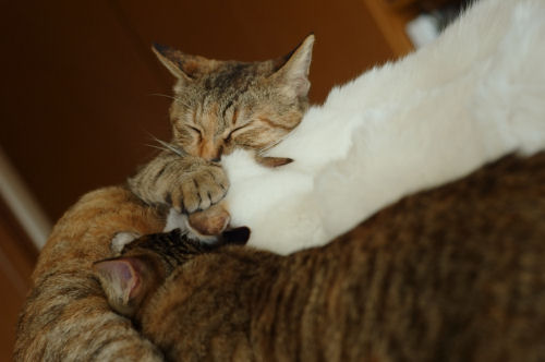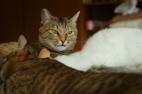 先日、久々にお庭の散歩に出かけたマリーシャ。 やっぱり外は気持ちが良くて快適のようです。 子猫たちは相変わらず元気で遊びまわっています。 時期をみて庭の散歩に出そうと思っていますが マリーシャもそのつもりなのか、 狩の仕方の模擬練習をよくしております。 一度は離乳したはずなのですが、またまたお乳をねだるように.... マリーシャは拒絶したり、頭をなめたり、子猫たちをなだめていますが 結局根負けしてしまいます。 「えさが足りない?」なんて思ってしまいます..... もっと増やしてみましょう~ 小さいときから甘えん坊のsherryはお乳をねだることをあきらめてはいません。 離乳する時期にはお乳しか飲まず、やせていました。 手に乗せて食べさせてみたら、バクバク食べ始めたで安心したものです。 それ以来、食欲旺盛、お乳もグビグビ、ずっしりと重くなりました。 メス猫の中では一番大きくなりました。 もりもり食べて、運動しているsherry。 庭に出たら、狩が上手いに違いありません。 PR |